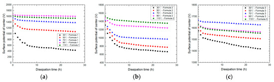 It was confirmed that the shapes of potential distribution curves under a normal-dominated electric field at different voltages for three formulas were the same as shown in Figure 8. Thereafter, if the polarity of the surface charge was identical, the potential at the sample center became proportional to the total charge quantity of the surface. Therefore, the center potentials of three formulas at different temperatures were measured and shown in Figure 10.