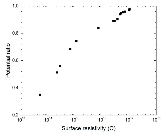 There are two theories that interpret the influence of the electric field distribution on surface charge accumulation. One insists that the normal electric field plays a major role in the accumulation [22,23]. The other proposes that the tangential electric field determines the surface resistivity and, thus, shows a dominated effect on the accumulation [24]. The results in this paper demonstrate that the charge was more likely to accumulate under a normal electric field because a similar potential was measured under much lower field strength. Therefore, the dependence of resistivity on the accumulation and dissipation processes would be investigated under a normal-dominated electric field in the following parts.