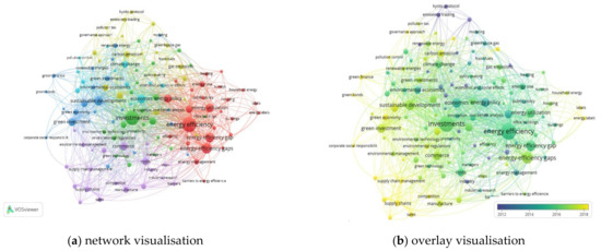 Findings of the scientific research on the energy efficiency gaps confirmed that scholars mostly analysed the energy gap from a technical viewpoint. The scientists in [1,2,3,4,5,6,7,8,9,10,11,12] analysed the energy efficiency gap at the company level as a result of insufficient technologies in the industrial sector. Moreover, the researchers in [13,14,15,16,17,18,19,20,21] defined the internal factors which influenced the company’s performance, involving energy efficiency. The bibliometric analysis (by means of the software VOSViewer v.1.6.10.) of 10,357 papers (with keywords: energy efficiency, energy efficiency gap, energy gap) published in a Scientific Journal indexed in Scopus and Web of Science showed that the scholars began to investigate the impact of the institutional quality and green investment on energy efficiency gaps. Thus, in Figure 1a, the investment (green cluster) was the mediator between sustainable development (navy blue cluster) and good governance (yellow cluster). Moreover, the overlay visualisation (Figure 1b) confirms that issues of the energy efficiency gap that has been studied since 2017. The relations between energy efficiency gaps, social and economic effects, and carbon trade have been studied since 2012. Scientists have been investigating the issues of green investment, green finance, and green bond concerning energy efficiency gaps since 2018 (Figure 1a). Thus, the authors of [22,23,24] proved that social and economic growth of a country influenced the energy sector development. The findings of the bibliometric analysis allowed defining the energy efficiency gap as a discrepancy between potentially possible and actual levels of the national economy’s energy efficiency due to the use of inefficient technologies of production, transportation and use of energy, limited green investment for energy renewal, and asynchrony of certain measures of the energy sector’s state regulation in the national economy.