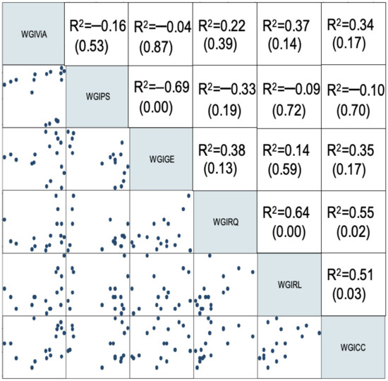 A correlation matrix of WGI for Ukraine, 2002–2019 (Source: developed by the authors). WGIVIA—political and civil liberties; WGIPS—government political stability; WGIGE—freedoms and qualifications of public authorities; WGIRL—public confidence in government action; WGICC—public perception of corruption; WGIRQ—the government’s ability to implement policies and regulations; R2—coefficient of determination.