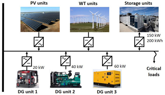 Scheme of a typical isolated microgrid including photovoltaic (PV) units, wind turbine (WT) units, storage units, and three different sets of diesel generators (DGs). The case is also studied in simulations.