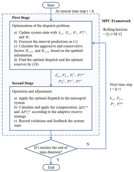 The second one is the operation and adjustment stage. At this stage, the microgrid system first operates according to the control policy obtained at the optimization stage. In addition, variations are detected during the period and the system would respond to them using the reserved capacity on the basis of the adaptive reserve strategy. The primary control and the secondary control are generally employed here to modify the reference value and compensate for the differences [40,61]. System capacity is always limited and the load demand may be unsatisfied in terrible cases even the dispatch and the reserves are properly scheduled. Hence, when a violation occurs, the violated power and other corresponding information will be recorded for further analysis. At the end of the time interval, dynamic changes have been completed and the new system state is sent to the optimizer as feedback. Then the MPC horizon is shifted and a new dispatch and control problem is to be solved similarly.