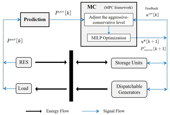 Figure 5 displays the actual energy flow in the microgrid system and the signal flow in the energy management. In the energy flow, only the storage units could both provide and utilize the energy power. In the signal flow, the predictors first collect the historical actual data of RES generation and load demand at time step k, then predict the intervals in the future and send the prediction to the management center (MC). In the meantime, the dispatchable components also send the actual operations to the MC as feedback. Then based on the prediction and current system capacity, the MC could grasp the future trends and know how to schedule and prepare to maintain certain system capabilities. By solving a MILP problem, the optimal dispatch and proper reserves for the next time step are obtained in the MC and then transmitted to the corresponding devices. At the next time step , the storage units and the dispatchable generators will operate referring to the optimal dispatch, and the actual power would be adjusted using the reserved capacity by the primary and secondary control to compensate for the potential variations. As a result, economic dispatches are achieved while ensuring system stability.