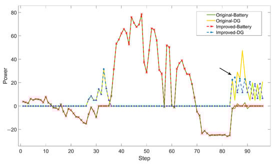 Actual operating power of diesel generators and energy storage units using the improved method and the previous method.