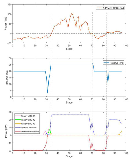 Simulation results related to the reserve strategy. (Top) the power differences of RES generation and load demand. (Middle) the total reserve level over stages. (Bottom) the reserve power in battery and DGs.