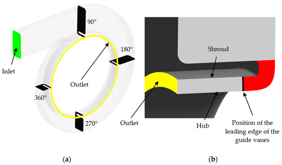 The design requirement was to use two-dimensional (2D) guide vanes instead of three-dimensionally (3D) shaped radial–axial guide vanes due to the cost. The 2D guide vanes would be located in the axial channel section downstream of the bend between the hub and shroud surfaces (leading-edge position indicated in Figure 1b). As a result of the design compactness reasons, it was necessary to locate the inlet to the 90° bend (red region) as far upstream as possible to keep the guide vanes within the width of the distributor. Due to a significant change in the flow direction, development of the efficient bend design can be challenging and time-consuming. An inappropriate design of this bend may result in flow separation, which throttles the flow, negatively influences the whole installation performance, and generates energy losses.