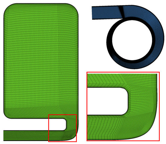 The initial investigations consisted of a steady-state 3D numerical simulation of the flow in the scroll with the commercial CFD software Ansys CFX. A mesh of the 3D scroll model was prepared with the Ansys ICEM CFD v 2019 R3 tool. A high-quality, fully structural mesh with nearly 4.8 million hexahedral elements and 4.9 million nodes was developed. The mesh in the whole model and a selected scan plane are illustrated in Figure 2. The general quality of the mesh was above 0.397 for the whole scroll. The lowest angle in the whole mesh was 23.4°, and only 3.2% of all elements had a minimal angle parameter lower than 45°. More than 82% of mesh elements had an aspect ratio parameter lower than 100, and 99.5% displayed a volume change parameter lower than 3. The element growth rate was set to 1 in all structural blocks adjacent to the wall. The listed mesh parameters fulfill Ansys CFX solver requirements [24].