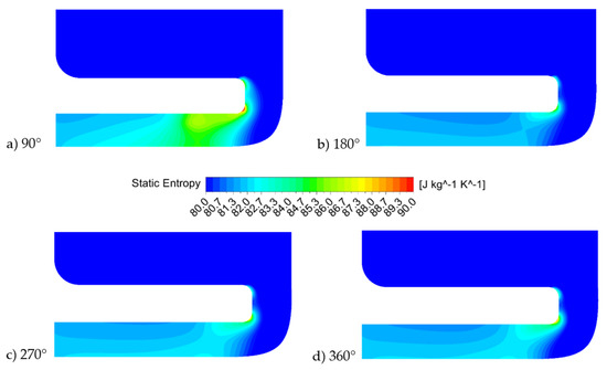Contours of static entropy for different cross-sections of the scroll distributor in specific locations: (a) 90°; (b) 180°; (c) 270° and (d) 360°.