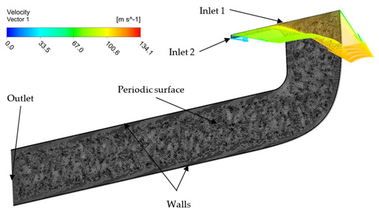 A setup for 2D computations is shown in Figure 7. Profiles of circumferentially averaged parameters (velocity vector components, static temperature, turbulence kinetic energy, and dissipation of turbulence kinetic energy) were applied. The velocity profiles are shown as vectors, indicating the existence of two velocity zones. The computational domain outlet is in the same location as it was for the full distributor, and the same boundary condition settings were applied there. Channel walls were defined as smooth and adiabatic. At the sides of the channel section, the periodic data exchange was specified, which was required in the quasi-2D simulations due to the inlet swirl. Similarly, as in the case of the simulation of the initial scroll configuration, steady-state simulations of the air flow (compressible–ideal gas) were performed for all cases under analysis. The flow was turbulent; therefore, once again, RANS simulations were conducted with the Shear Stress Transport (SST) turbulence model. The setup parameters are listed in Table 2.