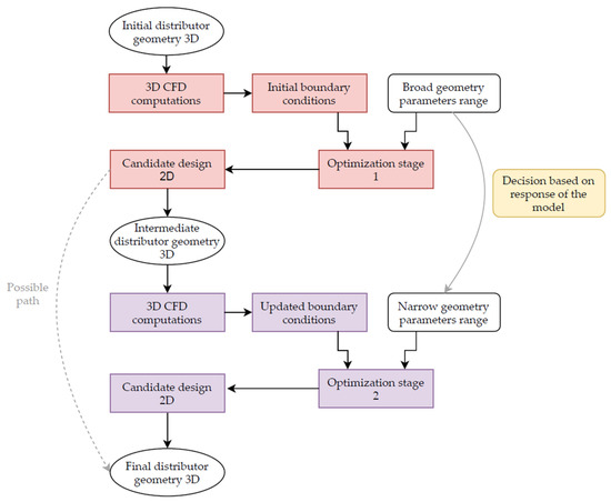 The need for a second stage comes from a specificity of this application, but it might be considered for every case where the change of initial shape is substantial and can importantly influence the flow structure, thus, the boundary conditions of the downsized case. Obtaining a very good approximation of the final solution from the first stage allows the second stage to be more detailed, leading to obtaining an optimized solution. In this study, the application of two stages also allowed narrowing down the variation of geometrical input parameters to optimized variables. If the change of a distributor shape was less significant, it might have been possible to apply only a single stage of optimization (indicated as a possible path in Figure 9) and take the first candidate design as a base for the final 3D distributor geometry.