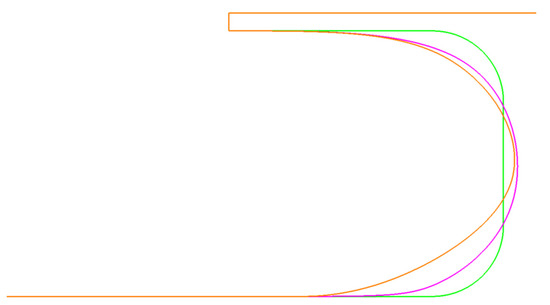 The channel geometry was prepared in the DesignModeler—a CAD module of the ANSYS 2019R3 software, which made the connection with other elements of the optimization loop easier. However, it could be done in any CAD software. The shape optimization procedure was carried out within the geometrical constraints of the distributor and the guide vanes channel. Only the internal wall shape was subjected to optimization, as a preliminary investigation showed its dominating influence. For a broader scan of design space, a high flexibility of bend shaping was allowed. The bent geometry was defined with a Bezier spline curve, which was based on five fit points, as illustrated in Figure 8. The curvature of the spline was controlled by five Bezier curve control points. Two of them were constrained as a tangent to the horizontal lines defining the channel walls; thus, its position could be changed along the horizontal axis only. The other three control points were changing positions along the vertical and horizontal direction. In total, eight variables were used to control the spline curvature. The dimensions allowing for point position control were selected as input parameters to the optimization module, which could change them in every iteration of the procedure. Limit values of geometrical parameters were chosen in a way that ensured feasible channel geometries. The geometry had to remain streamline—a continuous, non-crossing line to be considered as a possible solution to this problem.