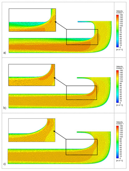 Velocity contours for initial (a), intermediate (b), and optimized (c) geometries.