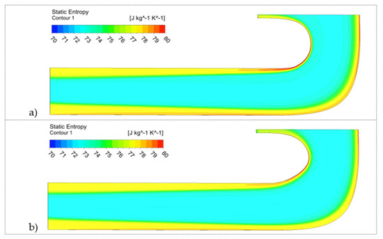 The static entropy contours for the intermediate and optimal curvature of the inner bend wall are presented in Figure 12. Both contours show a similar overall structure. The low entropy core of the flow is visible and surrounded by higher values for the regions of the inner and outer walls. The reduced entropy core is broader in the bend and narrows downstream of the channel. One can notice that the distribution of the static entropy at the outlet cross-section between the hub and shroud lacks extreme values; thus, it becomes more uniform. The difference between the intermediate and optimized cases is slight, with a higher entropy generation visible only at the bend for the intermediate case. The improved bend shape was followed by a decrease in entropy generation and hence flow losses.