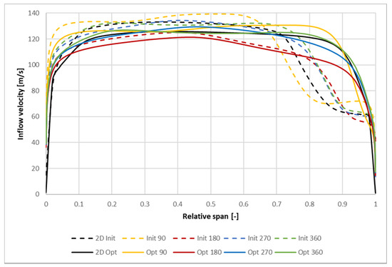Black lines on the chart represent the velocity obtained from 2D simulations. It can be seen that the velocity for the initial case (dashed line) is the most representative of the section near the tongue. One may conclude that the effect of that region on average is strong. The solid line representing the 2D results for the optimized geometry shows a good agreement with the 360° curve for most of the span. The velocity is lower than those from 3D solutions for the lowest values of the span, up to 0.1. This is a hub region, where the optimization did not take place. Therefore, it can be concluded that the method presented in this study allows for obtaining representative solutions with a simplified, two-dimensional geometry.