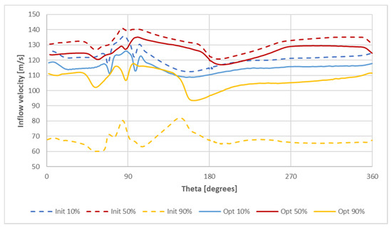 A circumferential distribution of the axial velocity component for initial and optimized geometries is shown in Figure 15 for three spans of 10%, 50%, and 90%. The uniformity of the flow (understood as a peak-to-peak difference of the velocity for the same span) is higher for the optimized geometry. The circumferential variation is also much smaller for the optimized geometry.