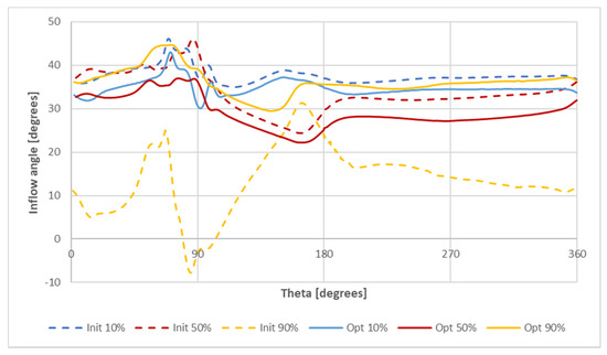 The angle distribution (Figure 14) shows a variation in the inflow angle. Similarly as in the case of the velocity, the most significant differences between initial and optimized cases are visible for the highest span values, where the influence of the bend geometry is the strongest. In the region of flow detachment, the angle values drop, making the upper part of the guide vanes work beyond the design conditions. The strongest effect, as in the case of the inflow velocity, is observed for the 90° section near the scroll tongue. The distributions for the optimized case are much more uniform, with an angle decrease observed for the region closest to the wall, at 0.95 of the span. A difference in the overall curves shape can be seen for different scroll sections, with the one at 90° standing out the most. The signs of separation are visible for the section at 90°, as the inflow angle drops below zero degrees. However, this zone is insignificant compared to the initial case. The shape of the angle distributions for 180°, 270°, and 360° in the optimized case is very similar, with a small discrepancy in the center of the span.