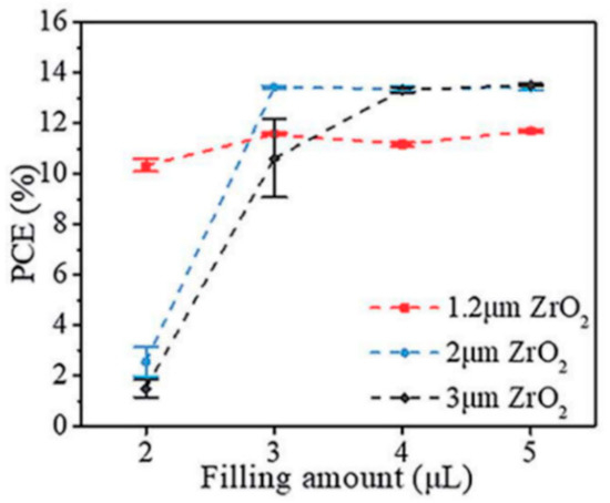 | [47] | TiO2(3)/TiO2(2)/ZrO2(2)/C(2) | AVA-MAPbI3, one step(a) | 10.81 (10) 2019 | 910/19.1/62 | Dual-sized TiO2 particles |