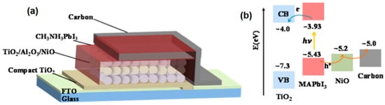 - Cao, K.; Zuo, Z.; Cui, J.; Shen, Y.; Moehl, T.; Zakeeruddin, S.M.; Grätzel, M.; Wang, M. Efficient screen printed perovskite solar cells based on mesoscopic TiO2/Al2O3/NiO/carbon architecture. Nano Energy 2015, 17, 171–179. [Google Scholar] [CrossRef]