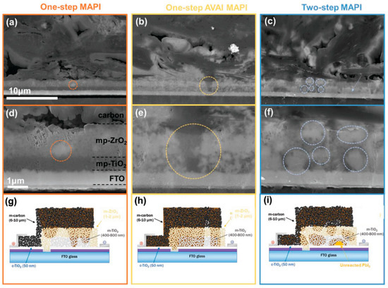 | [15] | TiO2(1)(50 nm)/TiO2(2)(0.6 µm)/ ZrO2(2)(1.5 µm)/C(2)(8 µm) | MAPbI3, two steps(a) | 11.3 (6.5) 2017 | 780/21.9/66 | NIR-fast annealing for the inorganic stack |