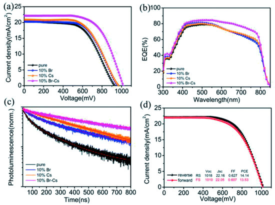 - Cho, K.T.; Paek, S.; Grancini, G.; Roldán-Carmona, C.; Gao, P.; Lee, Y.; Nazeeruddin, M.K. Highly efficient perovskite solar cells with a compositionally engineered perovskite/hole transporting material interface. Energy Environ. Sci. 2017, 10, 621–627. [Google Scholar] [CrossRef]