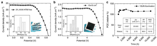 | [27] | FTO/TiO2/TiO2/perovskite (3% AVAI)/ZrO2/Carbon | sealed under an ambient environment, 55 °C, constant illumination without UV component | 11.9 | none | 10,000 h |