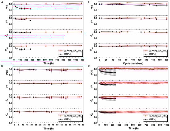 | [28] | FTO/TiO2/TiO2/AVA-MAPbI3/ZrO2/Carbon | maximum power point of 55 °C ± 5 °C, following the IEC61215:2016 Standards | none | 9000 h | |