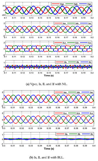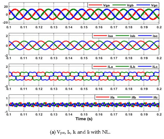 Under NL conditions, the THD of source currents decreased from 26 to 5.1%, as seen in Table 9. The magnitude of the source currents was also balanced. Therefore, the source currents were sinusoidal with approximately the same amplitude as presented in Figure 12b.