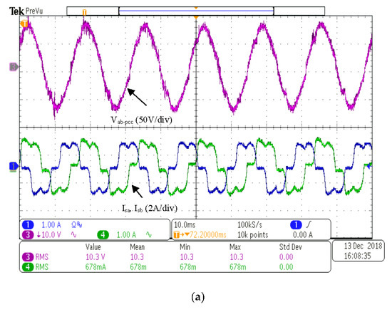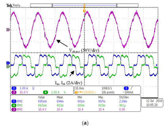 Phase A, B and C grid voltages were set as 10.5∠0° Vrms, 11.5∠−110° Vrms, 13.5∠110° Vrms, respectively. As given in Table 4, the THD of the source current was highly reduced with NL. The THD under BLL and ULL was low; however, there was a slight increase due to the switching harmonics from the inverter gates. Table 5 and Figure 8 demonstrate that the source currents were balanced and sinusoidal waveforms under different types of loads.