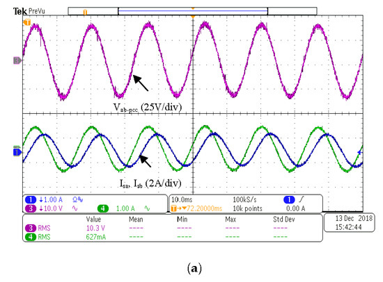 Balanced voltages were applied to the system, the voltages at the PCC were acquired, and the positive sequence components of the PCC voltages were extracted. As can be seen in the simulation results in Figure 4a, the extracted voltages match the PCC voltages as expected. The experimental results in Figure 4b show that the extraction method was able to determine the positive sequence voltages as well.