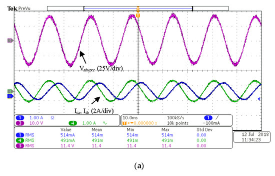 The shunt APF was able to eliminate the harmonics in the source current to obtain sinusoidal signals when NL was applied, as shown in Figure 9. Figure 9a displays the PCC voltage and source currents without the shunt APF. The shunt APF eliminated the harmonics resulting in sinusoidal source currents, as seen in Figure 9b. The THD of the source current decreased dramatically from 24.6 to 5.1%, as seen in Table 6. The THD measurement was obtained by the Tektronix Oscilloscope. The current magnitudes increased marginally, because the experimental control scheme used only ILa and ILb measurements; thus, ILc is determined on the basis of ILa + ILb + ILc = 0. There is, however, a small rise in the amplitude of the source currents.