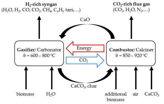 Indirect steam gasification that is operated in a dual-fluidized bed (DFB) reactor has shown great potential to produce a hydrogen-rich, almost nitrogen-free and tar lean syngas without the need for pure oxygen [5,6]. This is mostly due to the use of steam as gasification agent and because of the two separate reactors. In this process, biomass is gasified with steam at temperatures between 800 and 900 °C [7,8], producing a syngas that mainly consists of hydrogen (H2), carbon monoxide (CO), carbon dioxide (CO2), methane (CH4), light hydrocarbons (CxHy) and tars. The energy that is required for the endothermic gasification reactions is provided by the circulation of hot bed material between the gasifier and the combustor. In the combustor, unconverted char particles coming from the gasifier together with additional fuel (if necessary) are combusted with air as oxidizing agent for maintaining the required temperature for heating up the solids. Olivine was found to be a suitable bed material for indirect steam gasification as it is catalytically active towards tar reforming and has a high attrition resistance [9,10,11]. The process has successfully been demonstrated up to industrial scale in several facilities (e.g., Güssing, GoBiGas) [10,11,12,13]. As most of the synthesis processes require feedstock gases with higher H2 shares than provided by indirect steam gasification, a product gas treatment is needed that comprises a water–gas shift unit followed by CO2 removal. The sorption enhanced gasification process (SEG) (Figure 1) is a modification of the conventional indirect DFB steam gasification and uses limestone or other CO2-active sorbents (e.g., dolomite) as bed material. In this process, CO2 generated during gasification is directly captured by calcium oxide (CaO) forming calcium carbonate (CaCO3) (carbonation, Equation (2) [14]). The removal of CO2 from the gas phase leads to a shift in the water–gas shift (WGS) reaction (Equation (3) [15]) towards the product side, resulting in syngases with hydrogen contents of up to 75 vol% (dry basis) [16].