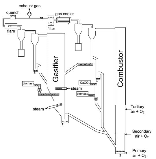 In the combustor, unconverted char particles coming from the gasifier are combusted with oxygen-enriched air that can be fed in three stages. Due to the relatively high heat losses in this pilot facility compared to larger-scale plants with a more favorable surface to volume ratio, additional biomass has to be fed to the combustor for enabling the required temperature that is necessary for calcination and for heating up the bed material. The addition of oxygen facilitates achieving the required heating power while maintaining the desired gas velocity. In larger-scale plants with lower load specific heat losses, the addition of oxygen would not be necessary. The use of oxygen-enriched air (yO2 < 50 vol.%) and the staged air supply permit the adjustment of the hydrodynamic profile in the reactor in such a way that a stable circulation of solids between both reactors and, therefore, a stable operation of the whole process is possible. Solids that are separated from the flue gas in the primary cyclone of the combustor are split into two streams. One stream is transferred via the screw conveyor into the gasifier, while the second one is recirculated back into the combustor. The mass flow of transferred solids can be adjusted by the rotational speed of the screw and the pressure difference between both reactors. After the primary cyclone, the flue gas passes a secondary cyclone and a baghouse filter before it is released via the stack. The loop seals of both reactors are fluidized with nitrogen, which is also used for purging the pressure transducers and the rotary valves.
