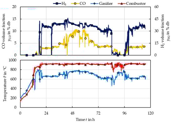 Trends of CO and H2 volume fractions in the syngas and temperatures in the gasifier and combustor during an exemplary experimental campaign.