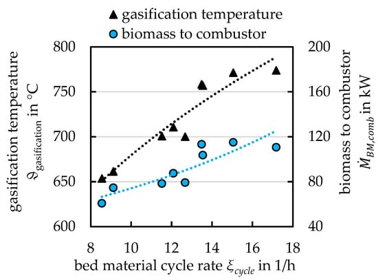 To demonstrate the influence of the gasification temperature on the permanent gases, experiments with gasification temperatures between 654 and 774 °C were conducted and compared to each other. Operational parameters such as S/C ratio (1.52 ± 0.02 mol/mol), WHSV (0.73 ± 0.03 1/h) and the biomass feed into the gasifier (30 kg/h, 138 kW) were kept constant. The gasification temperature was increased from 654–774 °C by adjusting the bed material cycle rate (Equation (4)), as can be seen in Figure 5. The bed material cycle rate in this case expresses the solid mass flow into the gasifier related to the gasifier bed mass. Due to the enhanced bed material cycle rate that is necessary to compensate for the increasing energy demand at higher gasification temperatures, more additional biomass is required in the combustor [27]. Therefore, the feed of biomass into the combustor had to be increased from 61 kW to 115 kW within the investigated temperature range (Figure 5). The high amount of additional biomass is mainly necessary as the heat losses of the facility are rather high. In commercial scale facilities with a better surface to volume ratio, heat losses would be lower and much less additional biomass would be needed. According to calculations of Brellochs for SEG in commercial scale, at gasification temperatures < 685 °C almost no additional fuel would be needed [27,28].