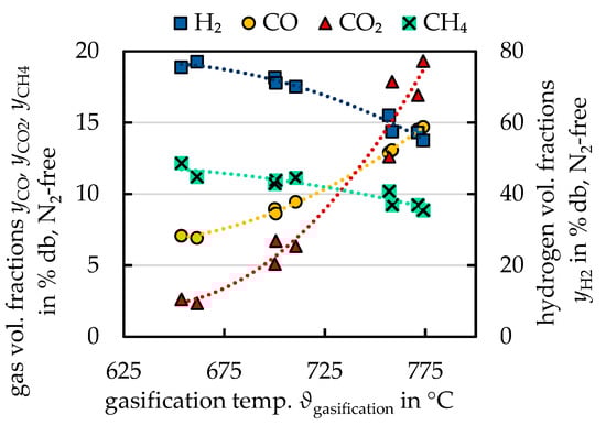 The influence of the gasification temperature on the composition of the permanent gases is presented in Figure 6, in which the gas volume fractions (dry basis (db) and N2-free) of H2, CO, CO2 and CH4 are plotted against the gasification temperature. Increasing the gasification temperature results in a lower hydrogen content, which is decreasing from 77 to 55 vol% within the investigated temperature range. Such high H2 concentrations are a result of the shift of the water–gas shift reaction (Equation (3)) towards the product side caused by the CO2 capture of the bed material. As less CO2 is captured at higher temperatures, the H2 concentration decreases. For the same reason, CO and CO2 concentrations are increasing with increasing gasification temperature. CH4 concentrations are decreasing from 12 to 9 vol.% (db, N2-free) for increasing the gasification temperature from 654 to 774 °C. Similar trends have also been reported in literature [7,29].