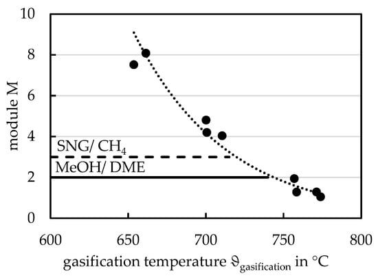 To avoid additional costs by conditioning of the syngas, the production of a syngas that is tailored for the following synthesis process is of high importance. The module M expresses the suitability of a syngas for dedicated downstream synthesis processes and is calculated according to Equation (1). For the investigated gasification temperatures, modules M between 8 and 1 were achieved as can be seen in Figure 7, showing a high flexibility of the process. By adjusting the gasification temperature, the syngas can be tailored e.g., to produce H2 (M as high as possible), Bio-SNG (M = 3) or MeOH/DME (M = 2).