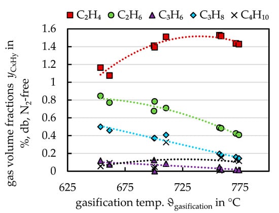 Gas volume fractions of C2H4, C2H6, C3H6, C3H8 and C4H10 are shown in Figure 8. The gas volume fraction of C2H4 increases with increasing gasification temperature up to a temperature of about 760 °C. At higher temperatures it decreases slightly. The gas volume fractions of C2H6, C3H6 and C3H8 are decreasing with increasing temperature, while for C4H10 no clear trend can be noticed. Such trends for C2H4 and C2H6 have also been observed by Schmid et al. [29].