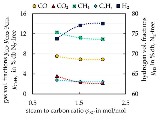 Gas volume fractions (db, N2-free) as a function of steam to carbon ratio for experiments with ϑgasification = 658 ± 8 °C and ξWHSV = 0.70 ± 0.03 1/h.