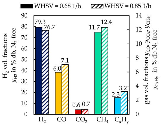 According to those results, a WHSV of 0.68 1/h seems to be more beneficial in terms of high H2 and low CH4 and CxHy gas volume fractions in the syngas compared to a WHSV of 0.85 1/h under the described operational conditions. That trend is in line with the observations of several authors in the literature [19,32].