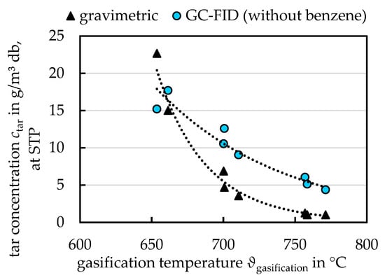 Gravimetric and gas chromatography and flame ionization detector (GC-FID) tar concentrations as a function of gasification temperature for experiments with φSC = 1.52 ± 0.02 mol/mol and ξWHSV = 0.73 ± 0.03 1/h.