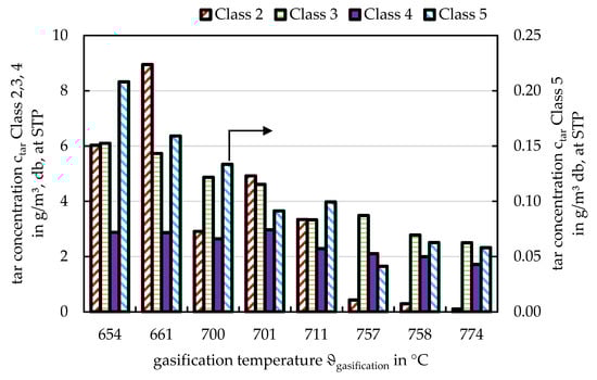 Gravimetric and GC-FID tar concentrations (on db, at standard temperature and pressure (STP)) are plotted in Figure 11 for gasification temperatures between 654 and 771 °C. The trends indicate a significant influence of the gasification temperature on the tar concentration with enhanced tar reforming for increasing gasification temperature as it is also reported in [19,29,34,35]. By increasing the gasification temperature from 654–771 °C, the gravimetric tar content is reduced significantly from 23–1 g/m³ (db, STP) while the GC-FID tars decrease from 18–4 g/m³ (db, STP). For gasification temperatures > 660 °C, the syngas comprises a higher amount of GC-FID tars than gravimetric tars. This indicates that the share of lighter tar components is enhanced at such high temperatures. The tar species considered in the GC-FID analysis (see Section 2.1) were classified according to standards of the Energy research Center of the Netherlands (ECN) as described in [36]. Class 1 tars represent gravimetric tar species [10] which are not detectable by GC-FID analysis and could therefore not be quantified. During SEG with wood pellets the tar classes 2–5 show a decreasing trend with increasing gasification temperature. At gasification temperatures up to about 715 °C, GC-FID tars mainly consist out of class 2 (heterocyclic aromatic compounds [36]) and class 3 (aromatic compounds [36]) tars, while at higher temperatures class 3 and class 4 (2–3 ring polyaromatic hydrocarbons [36]) tars are the major components as can be seen in Figure 12. The quantity of class 5 (4–7 ring polyaromatic hydrocarbons [36]) tars is for the whole temperature range the lowest.