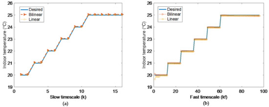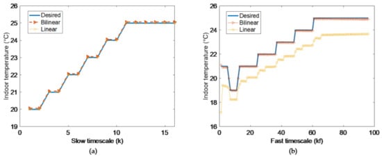 In the cases mentioned above, the optimization results of the bilinear model and linear model are shown in Figure 5. In slow timescale, we see that all states of linear model satisfy the desired temperatures, and the states of bilinear model also behave well with just acceptable little error. However, in fast timescale, if user set the desired temperatures with fluctuation at the first two periods (k = 1–2) of slow timescale (i.e., kf = 1–12 of fast timescale), and the desired temperatures at the endpoints (kf = 6, 12) coincide with that in slow timescale (k = 1, 2), there will be great deviation in linear model. Once state cannot meet the desired temperature, linear model will make the following optimization process based on a biased model after that. Since bilinear model is built in practice, following the practical situation well, it can satisfy the desired temperatures within acceptable scope.