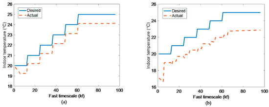 Two-timescale indoor temperatures in bilinear model (a) and linear model (b) with fluctuant desired temperatures.