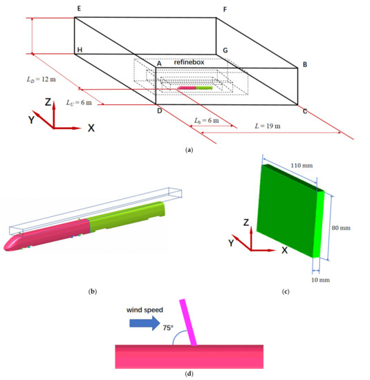 The model consists of head and middle car. Li et al. [26] used this model (head car, middle car, and tail car) as the object to research the influence of inter-car clearance extent on the aerodynamic performance of the train. In this paper, our focus is on the head car of the train. In order to ensure the consistency of the boundary conditions of the model, we retain the middle car without braking plates and bogies in the calculation model. The head car is selected because the head car aerodynamic force is not easily affected by the middle car. The model is a 1:8 scaled model, the characteristic height of the car is 0.52 m, and the length of the head car and the middle car are 3.45 and 3.125 m, respectively. The cross-section area of vehicle is 0.1687 m2. We installed two sets of braking plates in the head car. The length, width, and height of each braking plate are 110 × 80 × 8 mm. The angle of the braking plate is 75°. Because this angle is within the encouragement interval, the opening of the braking plate can be aided by wind force [3]. The geometric model of the train, the placements of braking plate, and calculation domain are displayed in Figure 1.