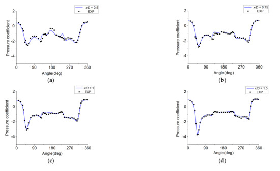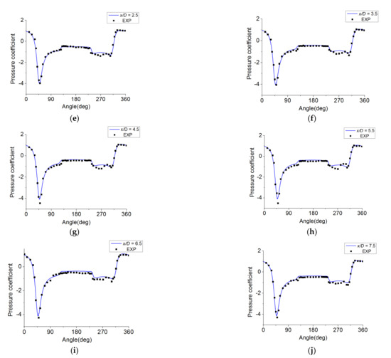 Pressure coefficient verification of simplified train: (a) Pressure coefficient verification at x/D = 0.50, (b)pressure coefficient verification at x/D = 0.75, (c) pressure coefficient verification at x/D = 1, (d) pressure coefficient verification at x/D = 1.50, (e) pressure coefficient verification at x/D = 2.5, (f) pressure coefficient verification at x/D = 3.5, (g) pressure coefficient verification at x/D = 4.5, (h) pressure coefficient verification at x/D = 5.5, (i) pressure coefficient verification at x/D = 6.5, and (j) pressure coefficient verification at x/D = 7.5.