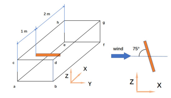 A two-dimensional flat plate can be regarded as an infinitely long flat plate in three-dimensional space. Therefore, the length, width, and height of the plate we chose are 1, 0.1, and 0.005 m, respectively. The plate model and the computational domain are shown in Figure 4.