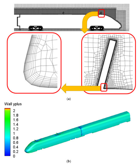 Model’s grid and y+. (a) Grid and boundary layer of train body and braking plates. (b) y+ of train body and brake plates.