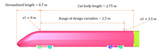 In the field of engineering optimization, the surrogate model method is widely used [31,32]. This paper studied the relationship between the position of the braking plates and the aerodynamic loads. Therefore, it requires that the surrogate model must have high accuracy in the entire design space. The design variables are the arrangement positions of the two braking plates: the position of the first plate is , and the position of the second plate is . Two boundaries of the design variables are the end of the streamlined shape and 2.5 m away from the end of the streamlined shape. The range of variables is shown in Figure 8. Two plates are arranged on the two boundaries of the design space, namely . In actual situations, in order to ensure that there is no assembly interference between the braking plates, the distance between the two plates cannot be infinitely short. This paper also limits the minimum distance between two braking plates. The distance between the two braking plates is not less than 0.1 m. Therefore, constraint can be described by inequalities (19)–(21):
