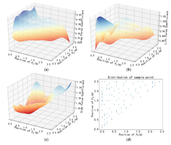 The average errors of the surrogate model in drag, side, and lift force are less than 3%. From this, we get a surrogate model with global high accuracy. Then, the relationship between the positions of the braking plates and the aerodynamic loads of the head car can be described by the surrogate model, as shown in Figure 9.