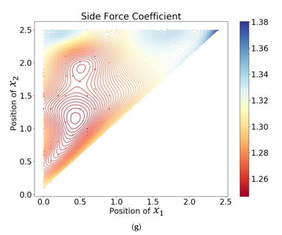 Figure 9a–c shows the relationship between the positions of the braking plate and the aerodynamic loads in the form of a three-dimensional (3D) format. Although the three-dimensional image allows us to intuitively understand the shape of the function, it is also difficult to see the full appearance of the function because of the occlusion of the curved surface. Therefore, we supplement Figure 9e–g. The subfigures show the relationship between the positions of the braking plate and the aerodynamic load in the form of a contour map and use color to indicate the amplitude of the aerodynamic load. The denser the contour lines’ distribution, the more drastic the aerodynamic load changes in this area. The points in Figure 9e–g are the sample points of the surrogate model. We observed that the color difference between most of sample points and the contour lines is so small that some points are even difficult to identify. This also indicates that the mapping precision of the surrogate model is high. The specific distribution of sample points is shown in Figure 9d. The entire design space is a triangle in the coordinate system because of the constraint of inequality (21). The sample points are located inside or on the boundary of this triangle. From a global perspective, the average differences between the drag, side force, and lift coefficients by the Kriging model and the CFD simulation are 2.474%, 2.944%, and 0.791%, respectively. Therefore, the global accuracy of the Kriging method used in this article is relatively high. But, considering that CFD simulation will have errors compared with experimental values, the surrogate model is constructed based on simulation values, so there will inevitably be a superposition of errors. Therefore, we should pay more attention to areas with obvious trends shown by the model, such as extreme areas, because these areas show strong consistency in both simulation value and model output values. In addition, the extreme value areas are also areas of more concern in engineering.